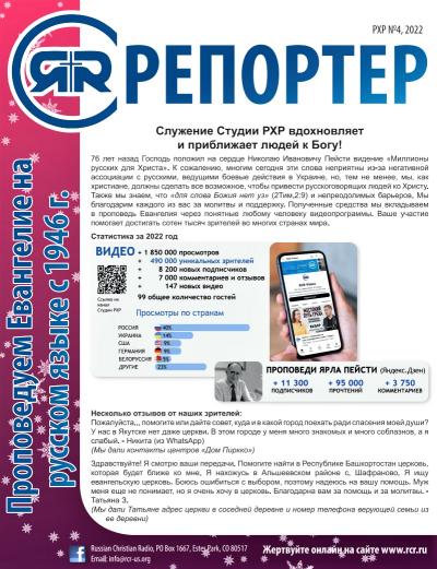 Охват зрителей из разных стран- 490,000. 76 лет назад Господь положил на сердце Николаю Ивановичу Пейсти видение «Миллионы русских для Христа». К сожалению, многим сегодня эти слова неприятны из-за негативной ассоциации с русскими, ведущими боевые действия в Украине, но мы знаем, что «для слова Божия нет уз» (2Тим.2:9) и непреодолимых барьеров.