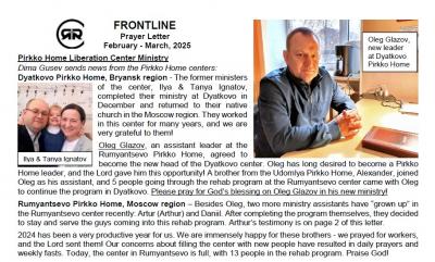 The Pirkko Home Ministry has a new leader at Dyatkovo center and two new assistant leaders at Rumyantsevo. The testimony of one of these men is on page 2. Please pray for them.